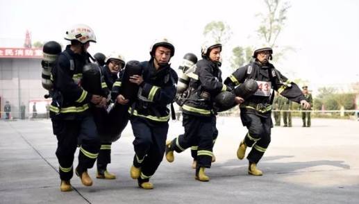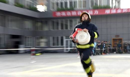 本次大比武共有三个项目:50米着战斗服折返跑、室内消火栓出水操、灭火救人综合操。